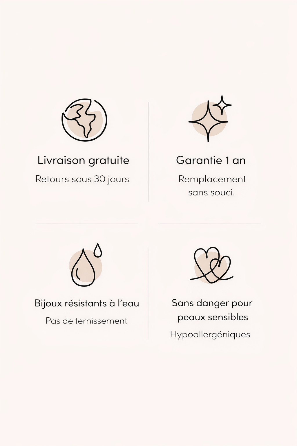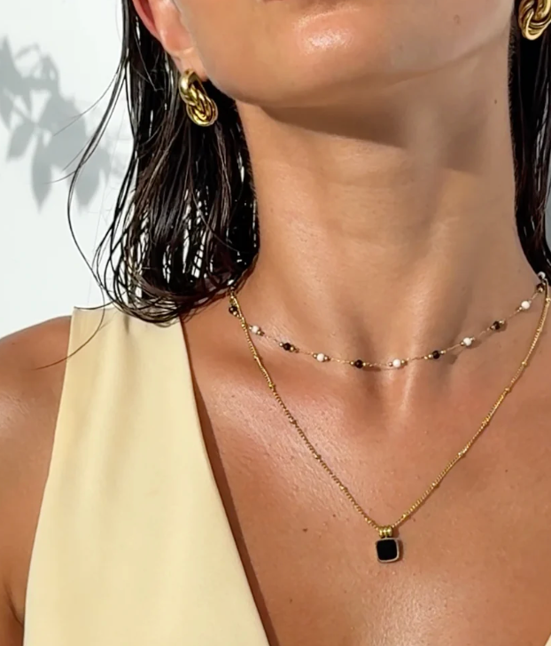 Tous nos bijoux sont fabriqués en acier inoxydable, sont 100 % résistants à l’eau et ne ternissent jamais, même portés à la piscine, sous la douche ou à la salle de sport.